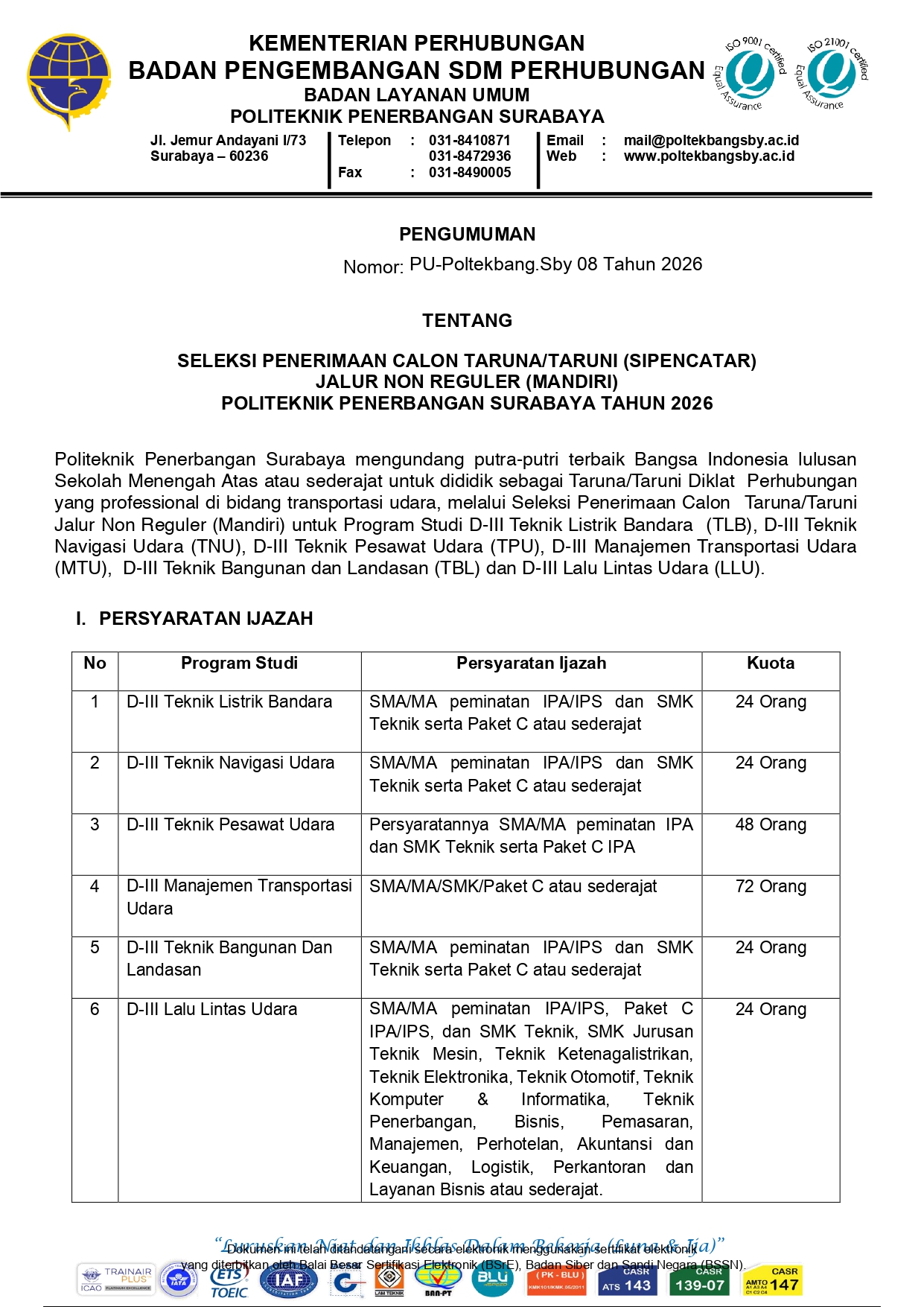 Politeknik Penerbangan Surabaya is proud to hold two prestigious ISO certifications: ISO 9001 and ISO 21001. The ISO 9001 certification demonstrates our commitment to maintaining a high standard of quality management across all institutional processes. This ensures continuous improvement, efficiency, and the delivery of high-quality education and services to our students and stakeholders. Meanwhile, the ISO 21001 certification reflects our dedication to educational management excellence, as it focuses specifically on the standards for educational organizations. It confirms that we consistently provide educational programs that meet the needs and expectations of our students, staff, and regulatory bodies. Together, these certifications highlight our pursuit of excellence and dedication to providing internationally recognized aviation education.